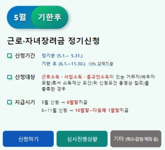 근로장려금 신청은 매년 정해진 기간에 이루어집니다. 일반적으로 5월 중에 신청할 수 있으며, 정확한 일정은 국세청 홈페이지에서 확인할 수 있습니다.